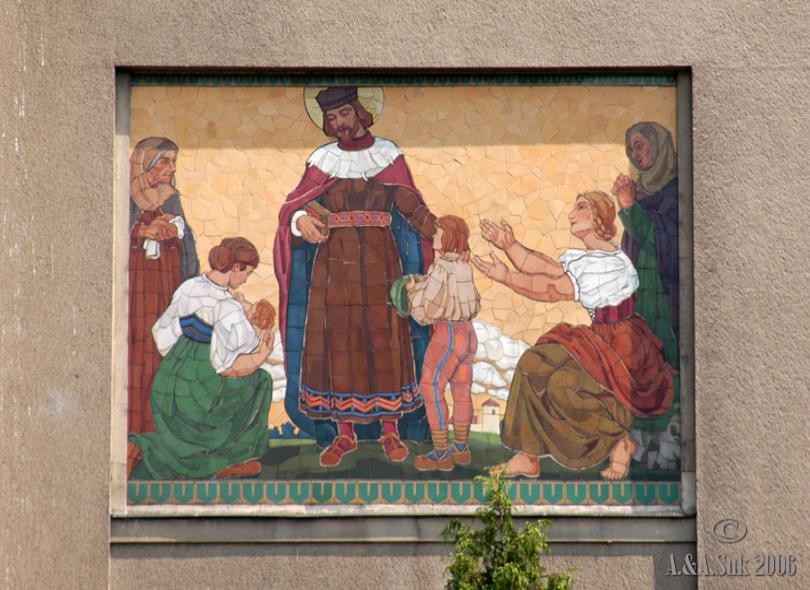 façade are tile mosaics depicting St. Wenceslas with a bible educating peasants and St Ludmila giving bread to the poor bread. As the entire complex